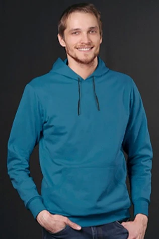 Модель. Прямой силуэт. Толстовка без молнии. Длинные рукава. Низ толстовки и рукавов обработаны тканью кашкорсе (специальная тканая резинка) в цвет толстовки. Один общий карман по типу кенгуру. Капюшон пришивной двухслойный, внутренний слой из однотонной кулирной глади с лайкрой стандартных цветов на выбор. У края капюшона продет плоский шнур стандартных цветов.