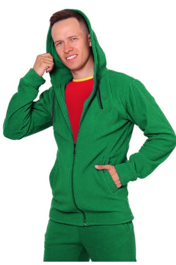 Модель. Прямой силуэт. Толстовка на молнии. Длинные рукава с манжетой из основного материала. Толстовка с пришивным капюшоном. У края капюшона продет плоский шнур стандартных цветов.  Два прорезных кармана в листочку без молнии.  Возможно бесплатное комбинирование деталей разных цветов (например, рукава могут отличаться по цвету от остальных деталей). Для большего удобства при открывании и закрывании на молнии установлены пуллеры.