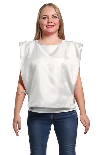 Модель: Накидка прямоугольной формы без карманов. Возможна обработка края накидки швом вподгибку, горловина обрабатывается косой бейкой, завязки выполнены из брючной ленты белого или черного цветов, длиной 30 см.