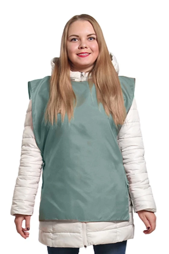 Модель: Накидка прямоугольной формы без карманов. Обработка края накидки швом вподгибку, горловина обрабатывается косой бейкой, завязки выполнены из брючной ленты белого или черного цветов, длиной 30 см.