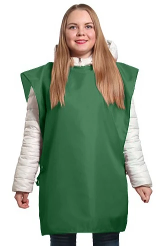 Модель: Накидка прямоугольной формы без карманов. Обработка края накидки швом вподгибку, горловина обрабатывается косой бейкой, завязки выполнены из брючной ленты белого или черного цветов, длиной 30 см.