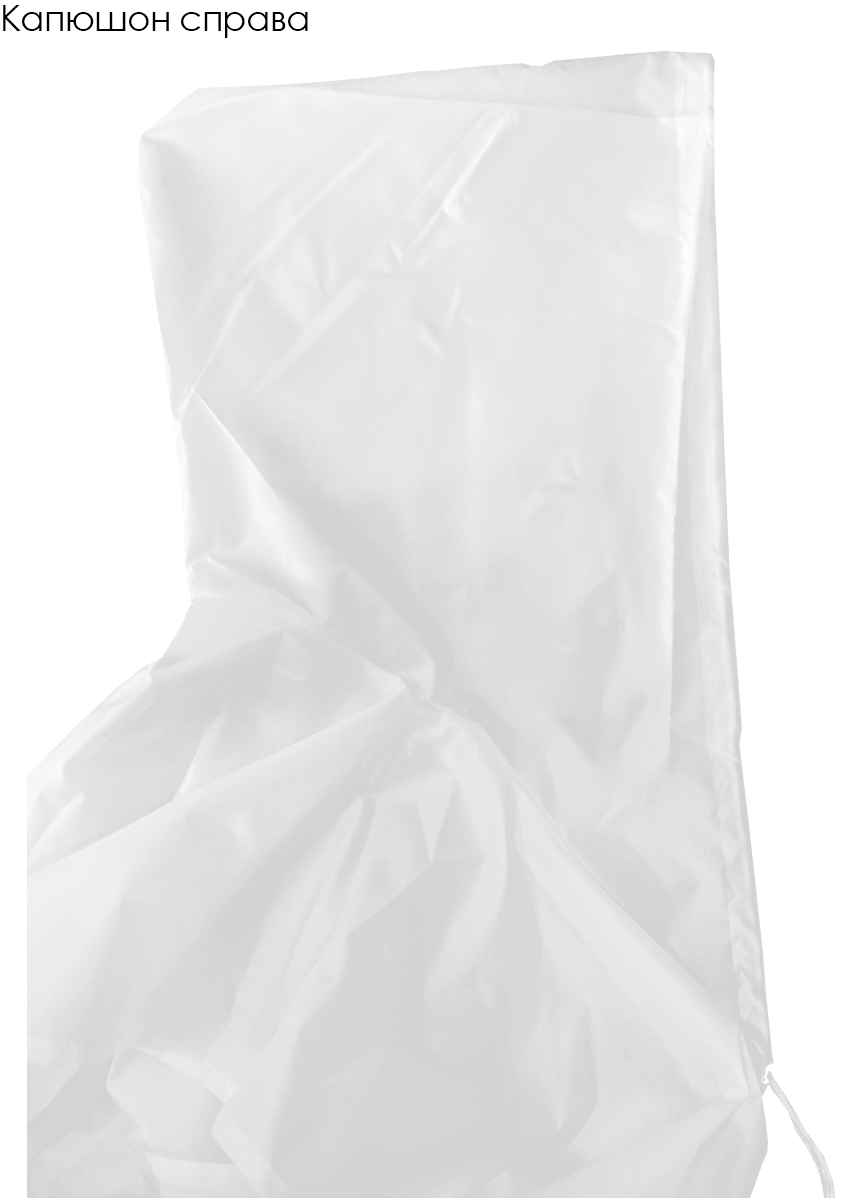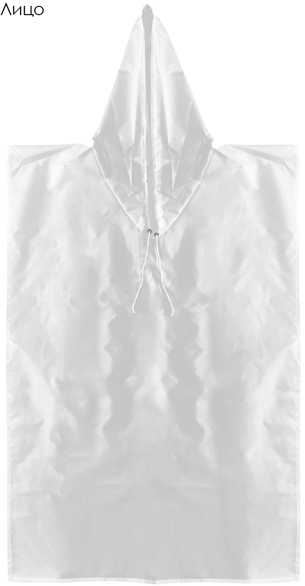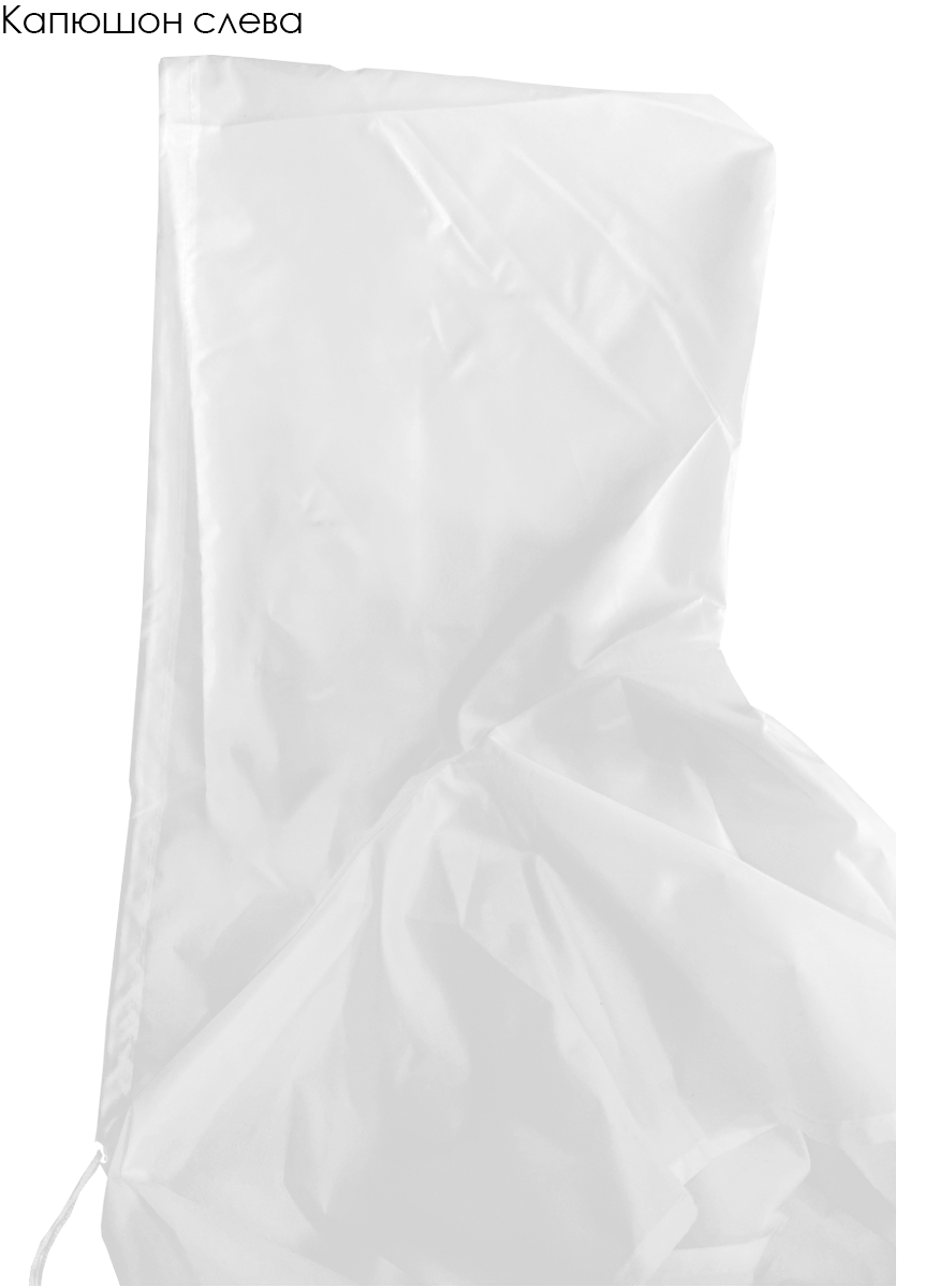 Модель: Накидка прямоугольной формы с капюшоном, без карманов. По желанию клиента накидка может быть пошита с одним карманом 20х25 см, либо двумя карманами 13х16 см (оплачивается дополнительно). Капюшон пришивной, фиксируется на кулису из полиэфирного шнура стандартных цветов. Края накидки обрабатываются швом вподгибку. Завязки выполнены из брючной ленты белого или черного цветов. Длина завязок 34 см.