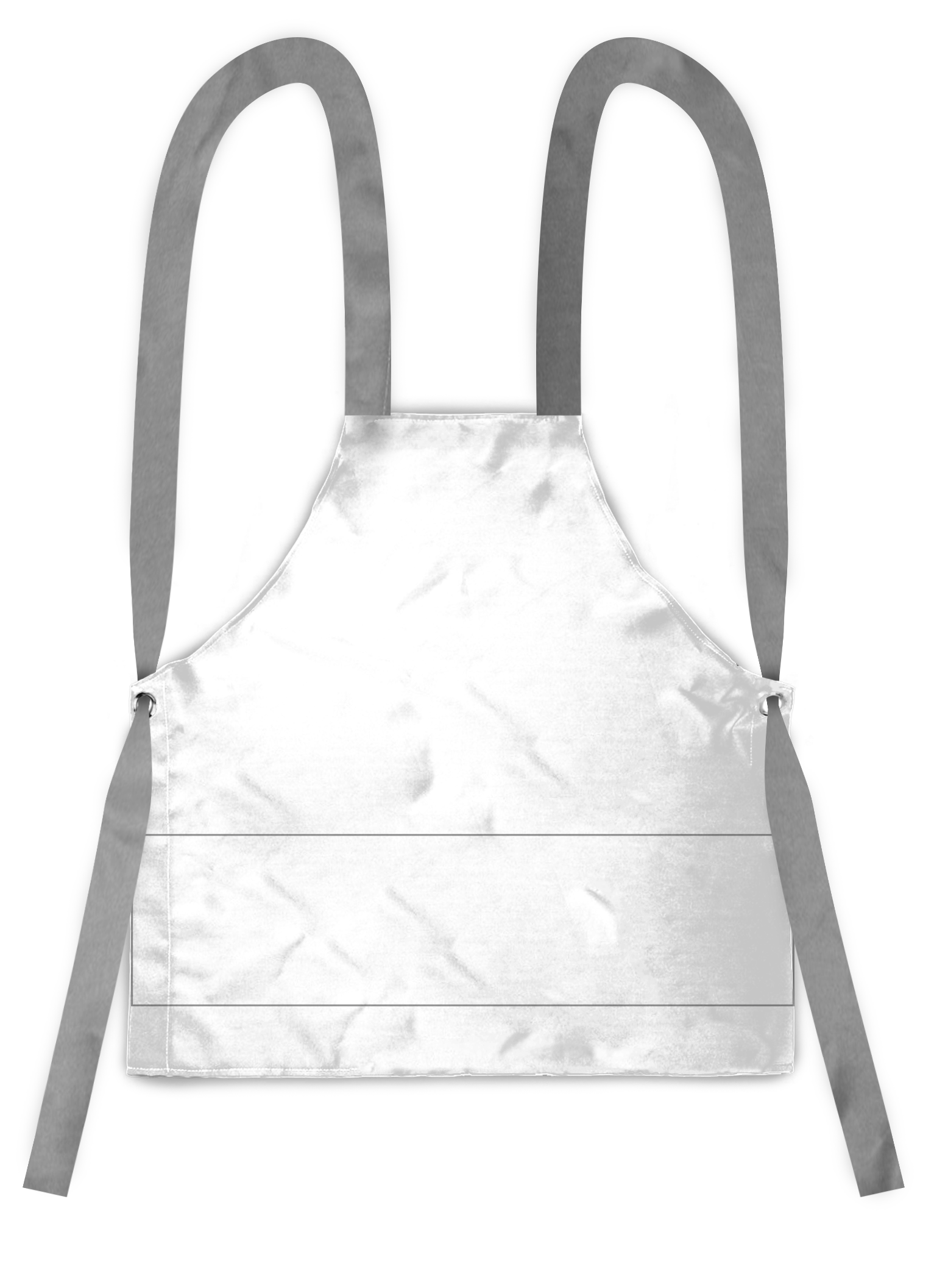 Модель: Фартук фигурной формы без разреза. Фартук по периметру обработан швом вподгибку. Фартук может быть изготовлен с одним карманом 18х70 см, разделенным на 6 отсеков, либо с тремя карманами: два боковых 18х20 см и один карман на груди 13х12 см. Креплением служат перекрещивающиеся на спине лямки. Лямки из основной ткани фиксируются на груди с помощью двух пластиковых регуляторов черного цвета. В районе пояса лямки продеваются через два никелированных люверса диаметром 15 мм.