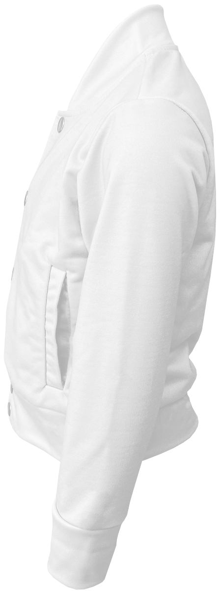 Модель. Прямой силуэт, без капюшона. Длинные рукава с манжетами из сублимационной ткани прима. Низ бомбера и воротник с закругленными углами также выполнены из сублимационной ткани прима. Вариант застежки бомбера на выбор: на шесть металлических кнопок или на молнию. Два боковых кармана в листочку без молнии.