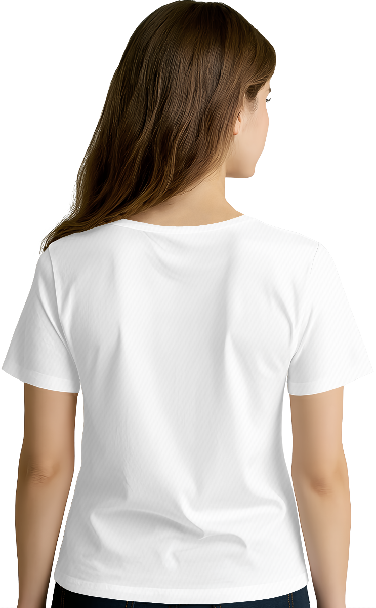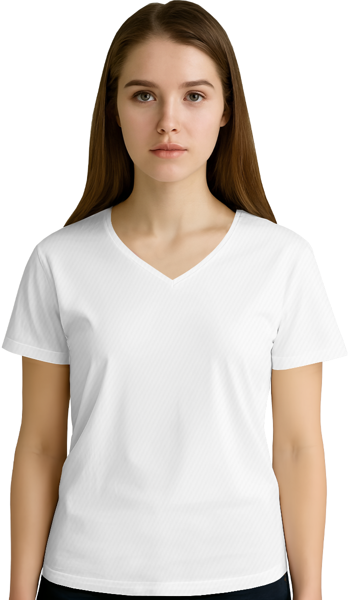 Модель. Приталенный силуэт. Футболка имеет боковые швы без разрезов по низу изделия. Оформление горловины руликом (кантом) из основной ткани или рибаной. Форма ворота V-образная.
