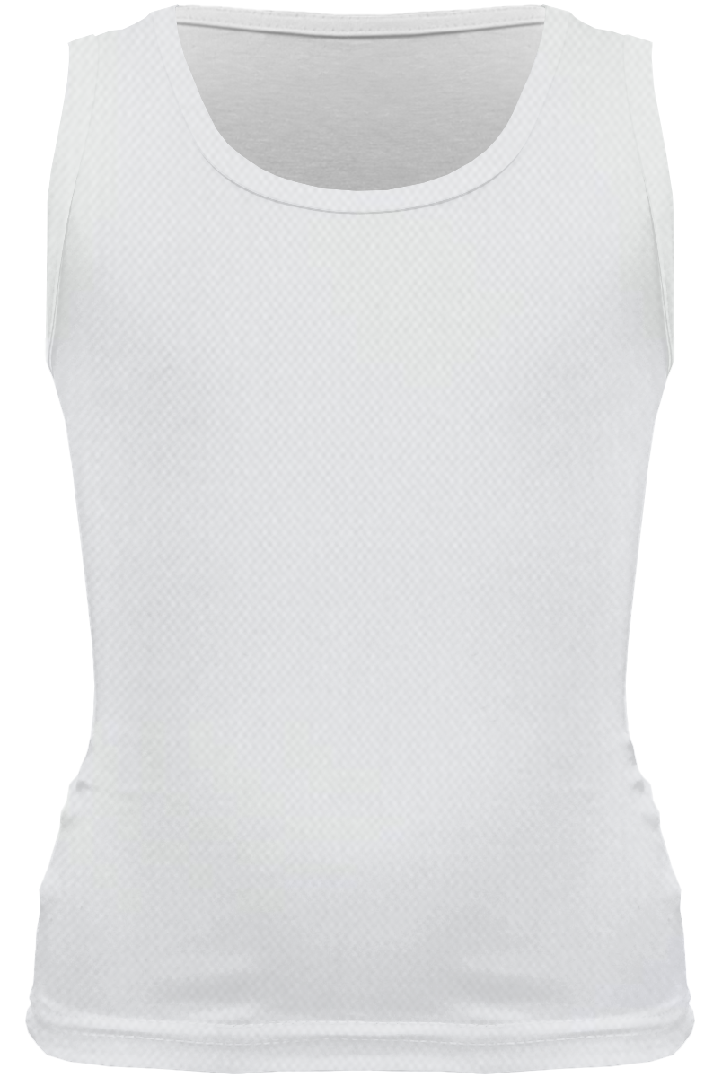 Модель. Майка с прямым силуэтом. Пройма рукавов и горловины обработаны руликом (кант из основной ткани). Майка имеет боковые швы без разрезов по низу изделия. Форма ворота О-образная.