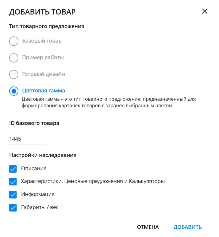 Цветовая гамма - карточка для вариантов товара в разных цветах.