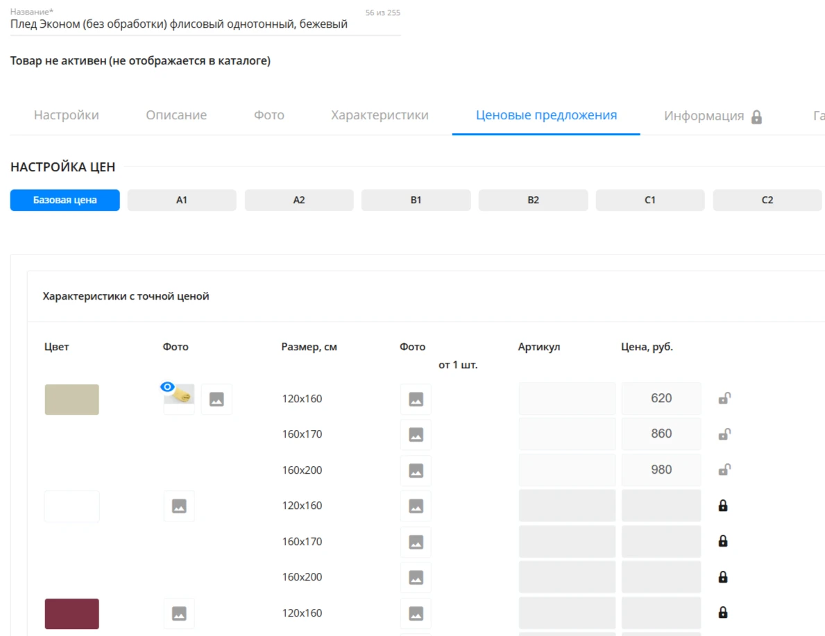 - связь с базовым товаром можно отключить, чтобы изменить цену вручную.