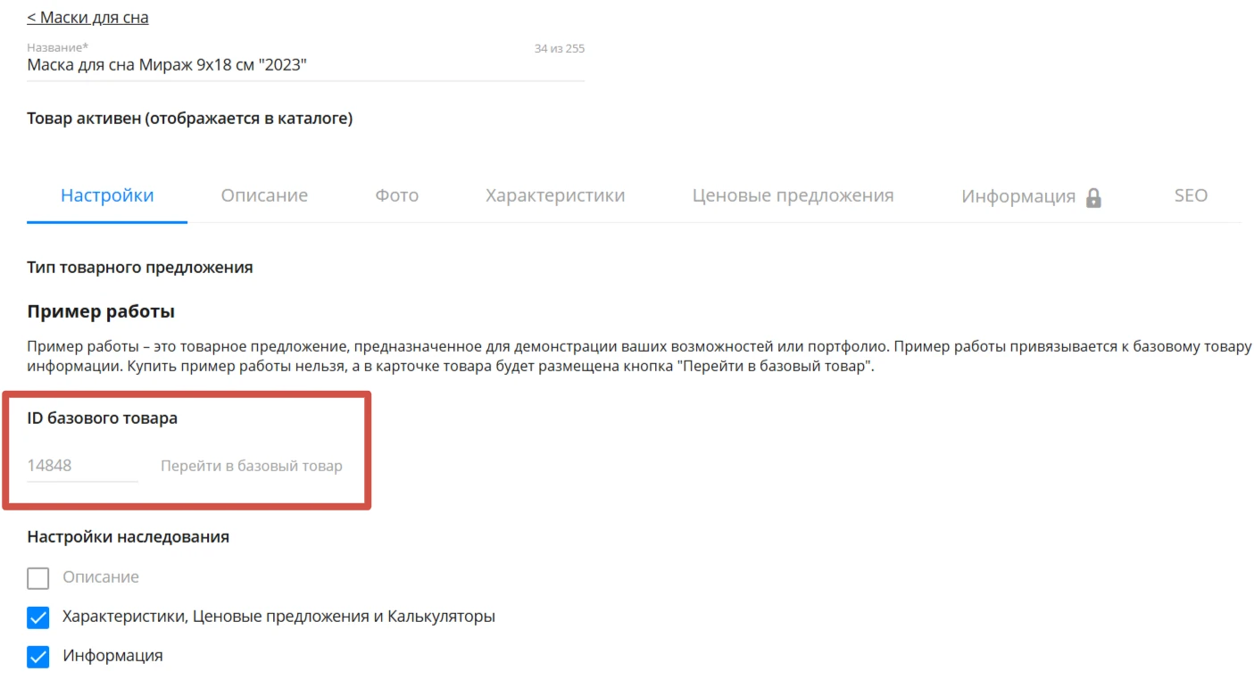 - привязывается к базовому товару и может наследовать часть информации;