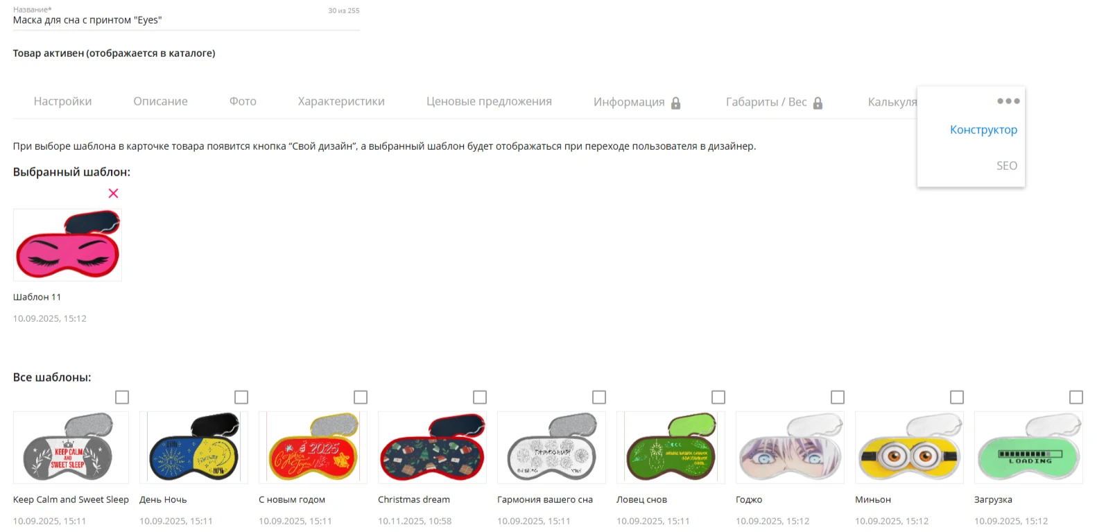 - в редакторе можно создать готовые шаблоны и подвязать к карточке товара;